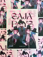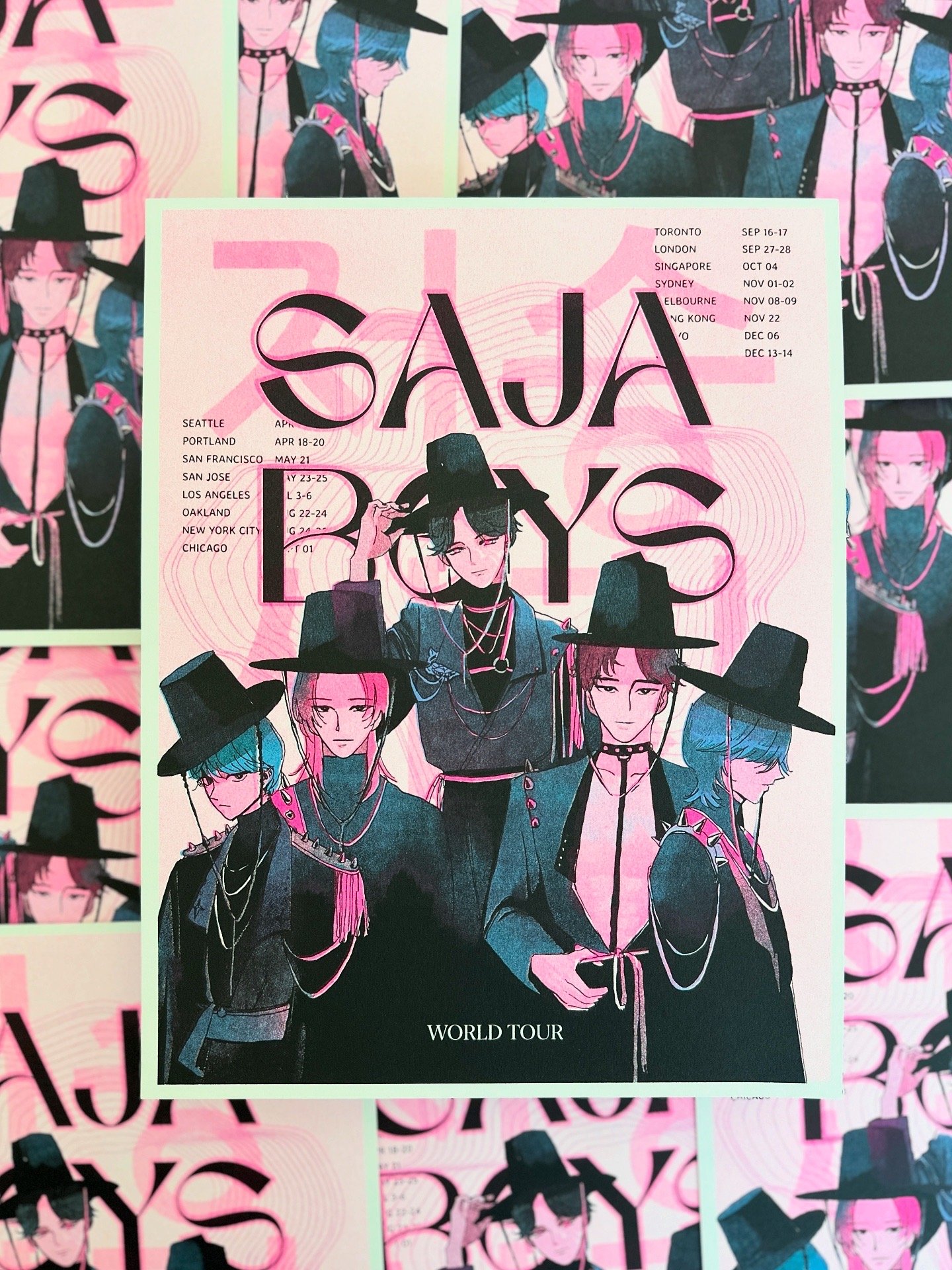 8.5x11 risograph print! Black, aqua and fluo pink, printed on 80lb cover, warm white paper. Due to the nature of risograph, variations may occur between prints. Choose between Saja Boys, Huntr/x!