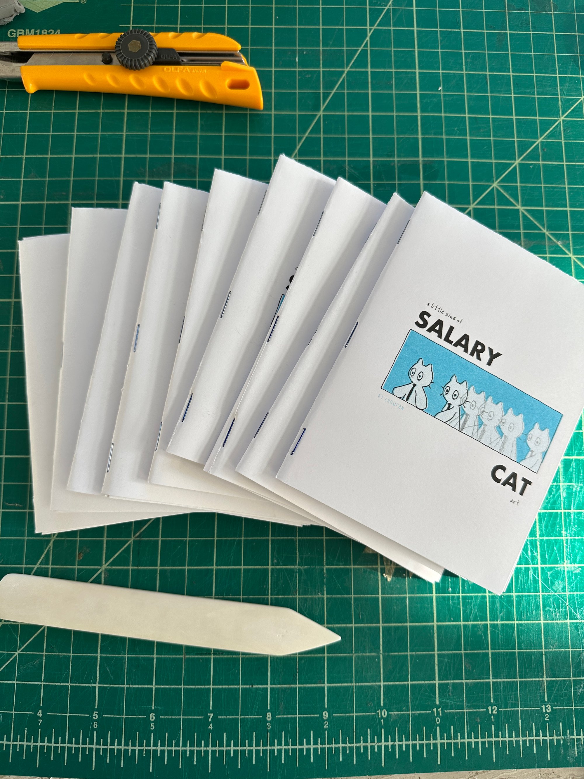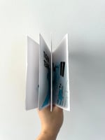 roughly 4.25"x5.5", 8 page risograph zine, printed with black and aqua ink. Printed on thick cover paper, this zine is individually hand folded, cut and staple bound by me! It is very hand made and one of a kind- each page is uniquely, slightly differently sized ;)