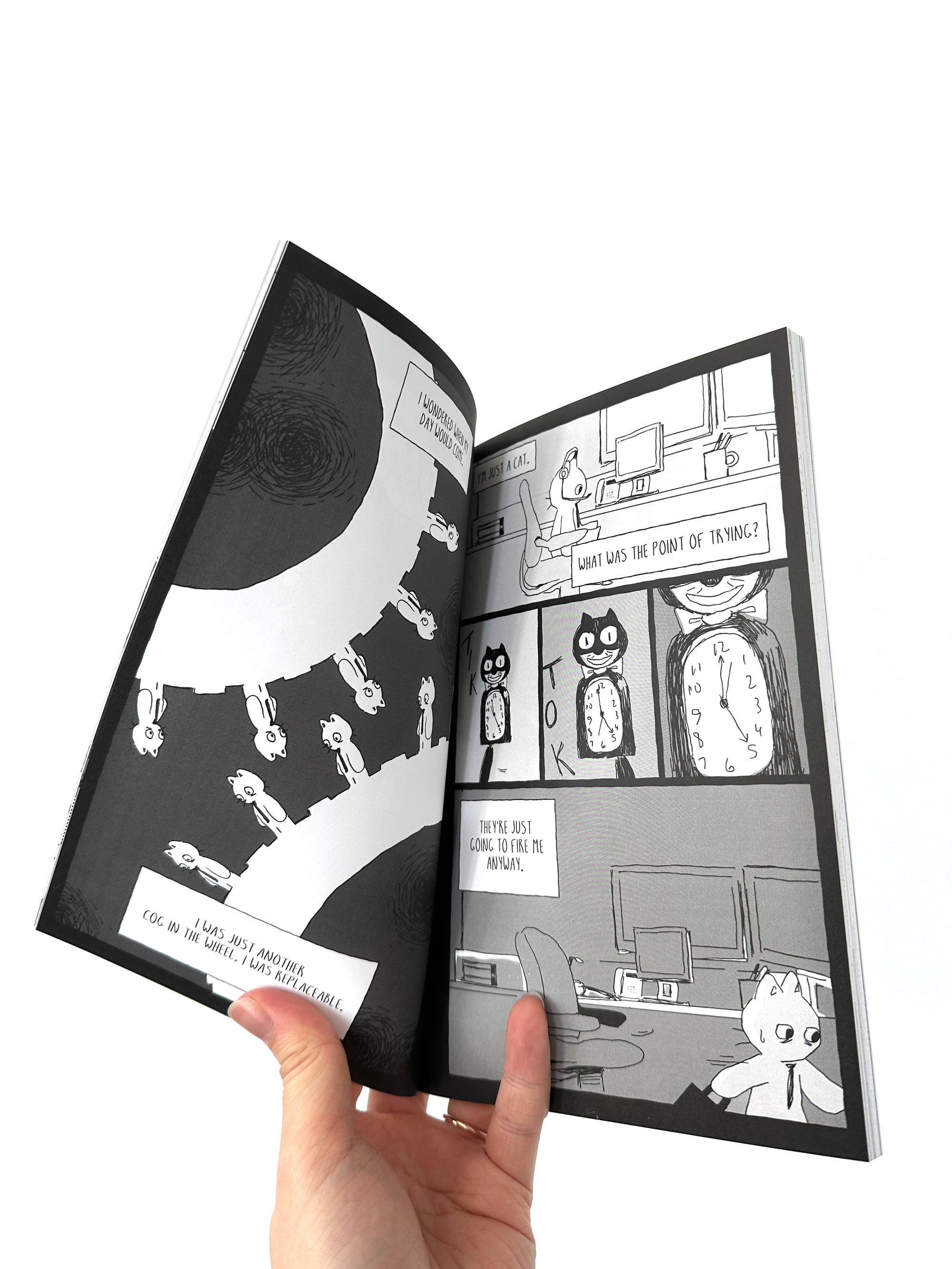 A loosely linear plot about a cat with a corporate job. Softcover, 5.5"x8.5", 84 pages printed on 80lb paper, color cover and grayscale inner pages.