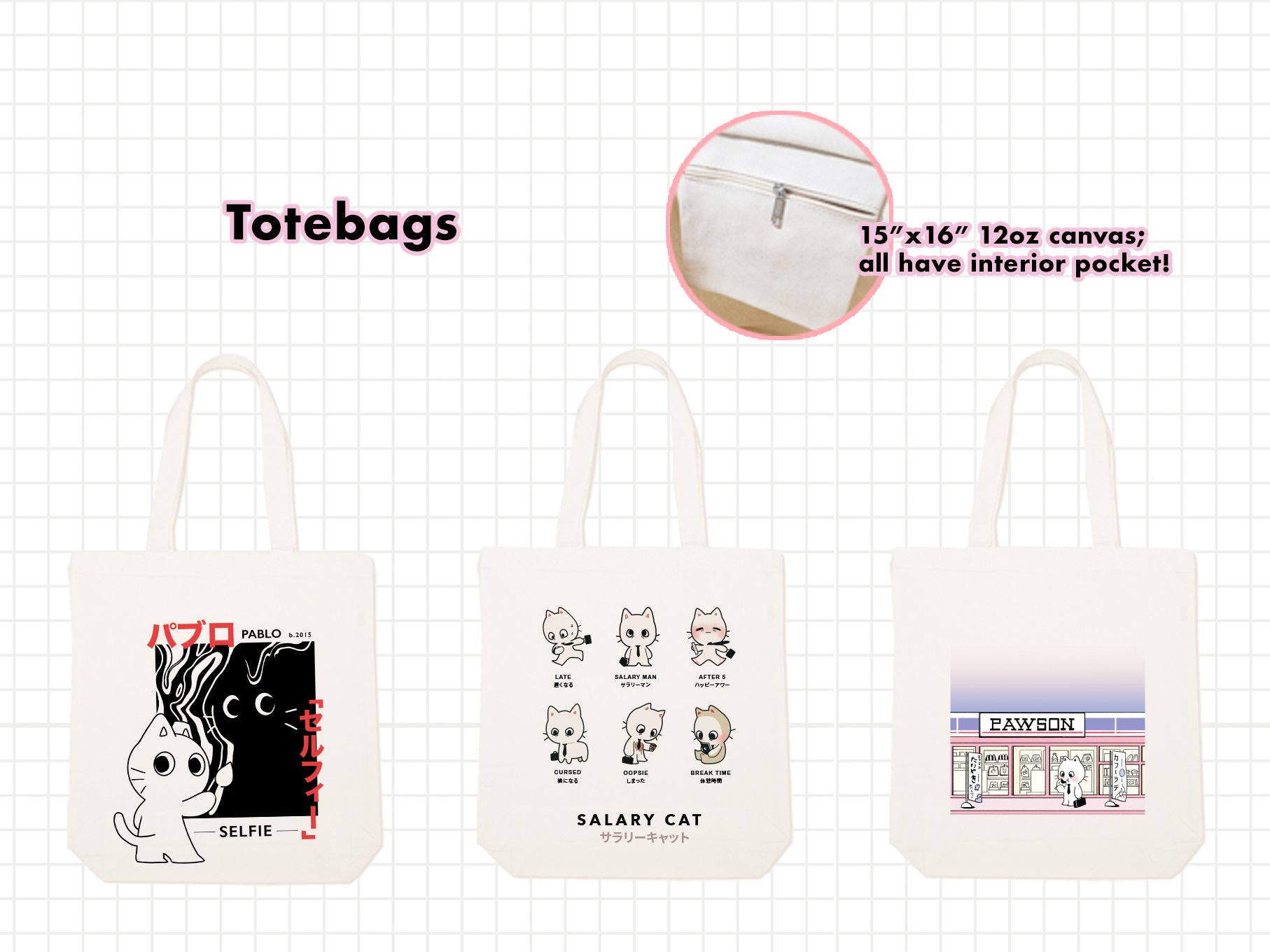 12 oz canvas totebags. Measures 38cm x 41cm x 8cm (~15in width x 16in height x 3in depth). Has a zippered pocket inside that measures 9cm x 15cm (3.5"x 5.9").